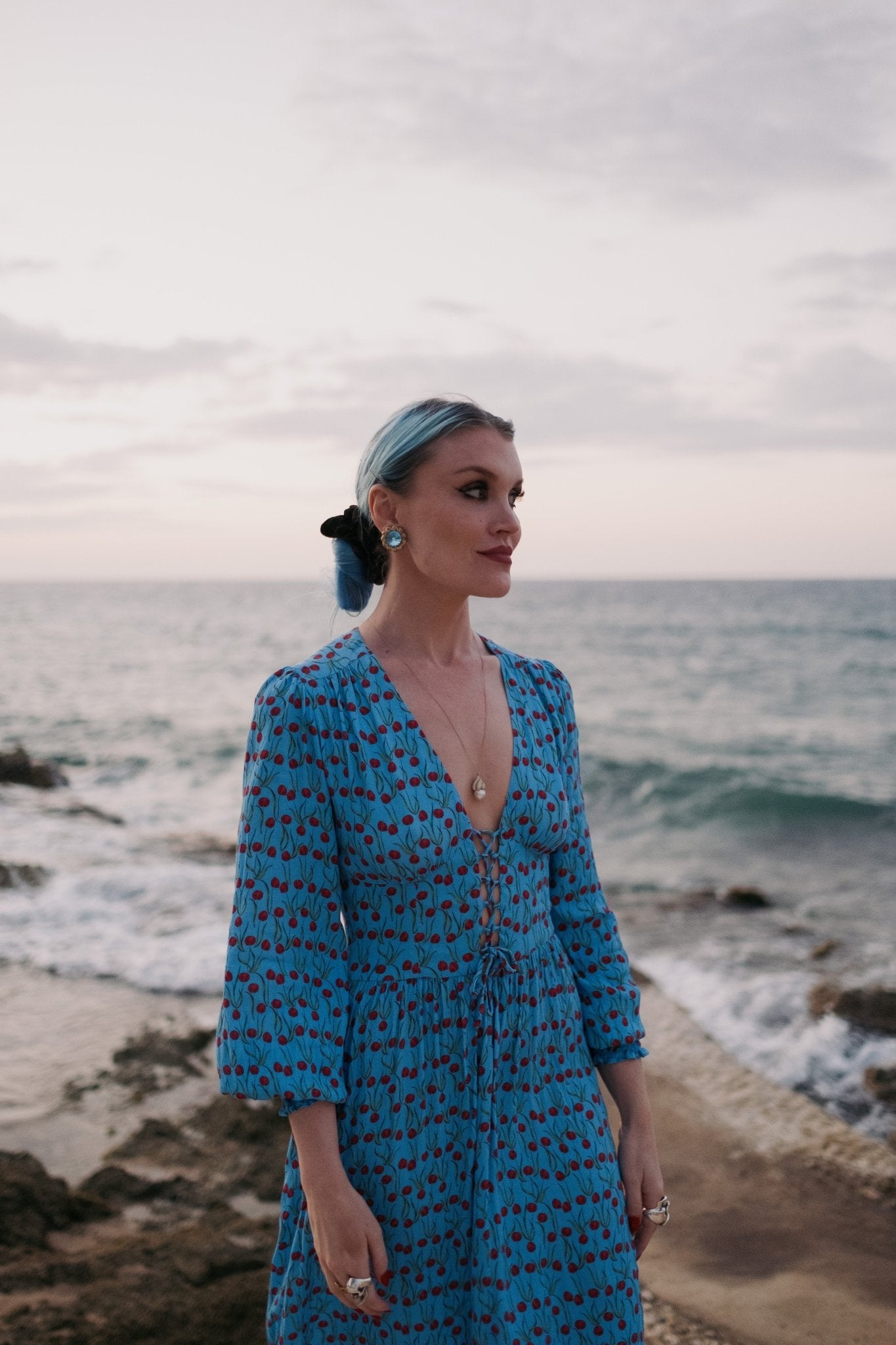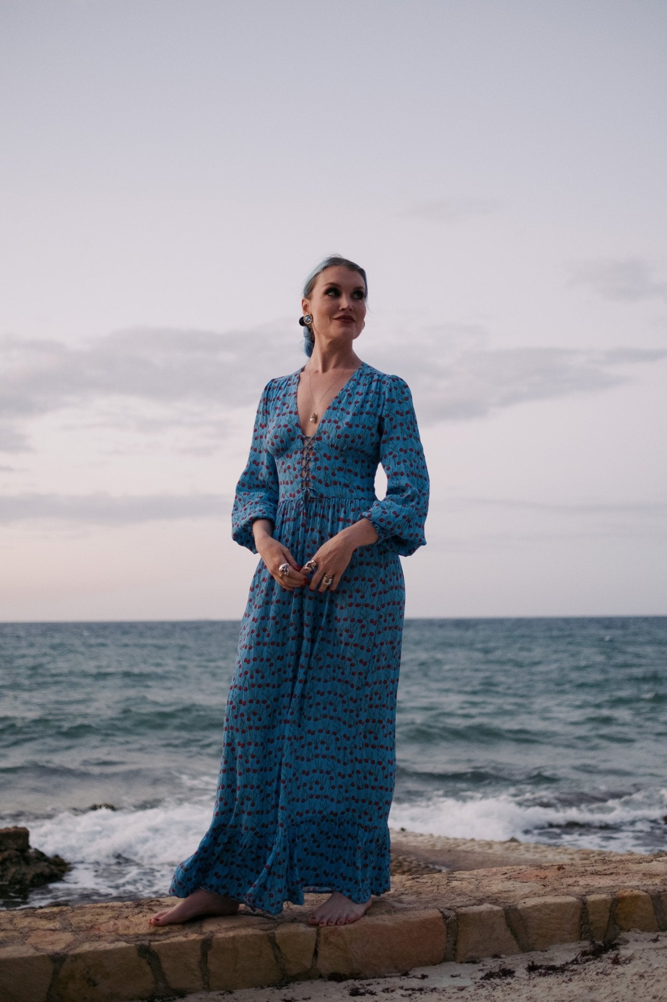 Moss crepe maxi loren shape dress with fabulous sunbathing lady and floral print. Nettie wears...