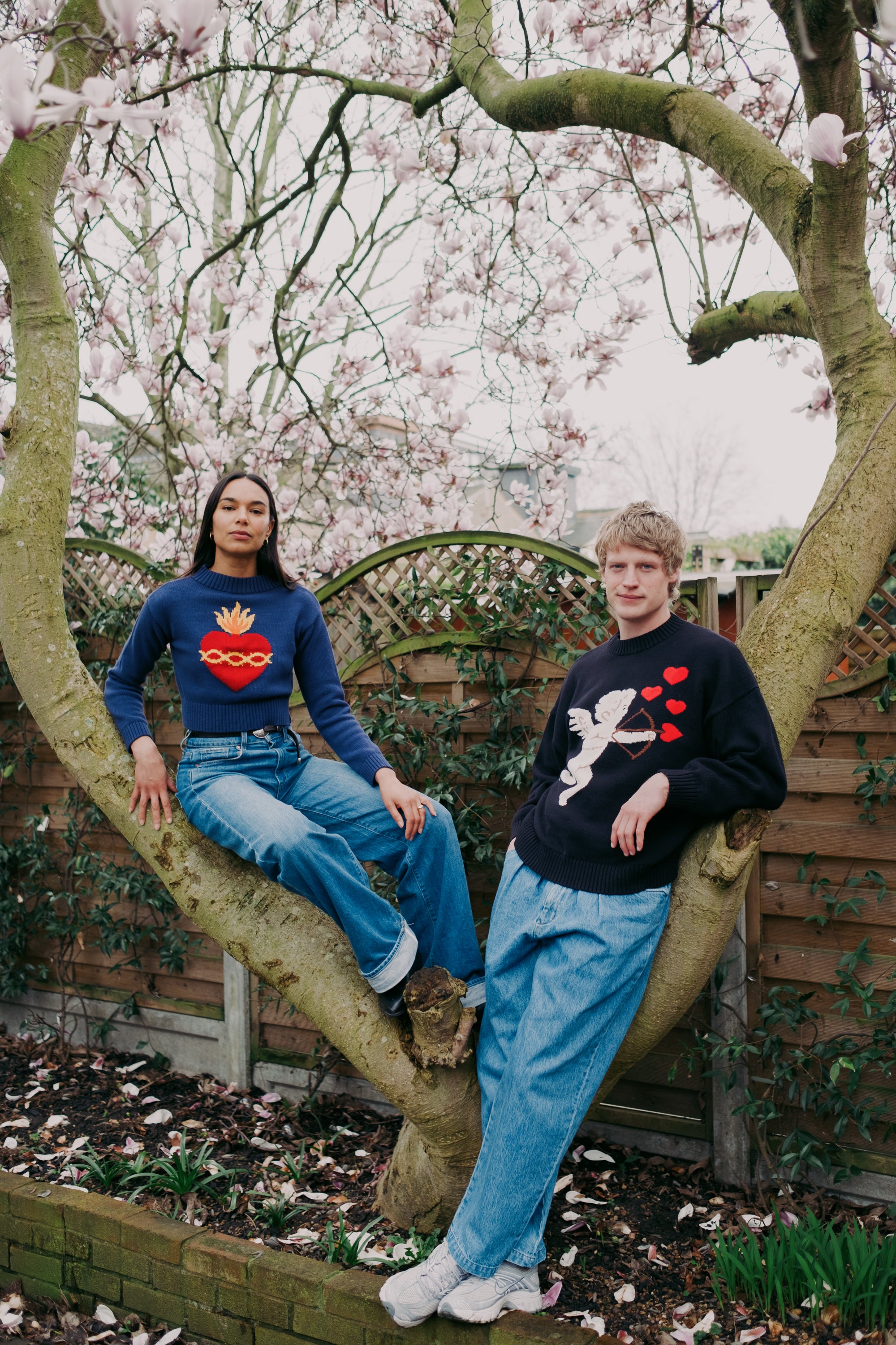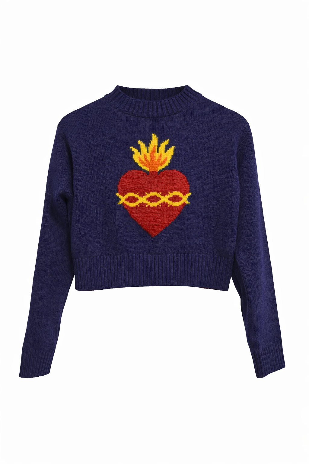 Navy blue cropped shape jumper with a flaming sacred heart! Made in intarsia knit 100% cotton. *pre-order...