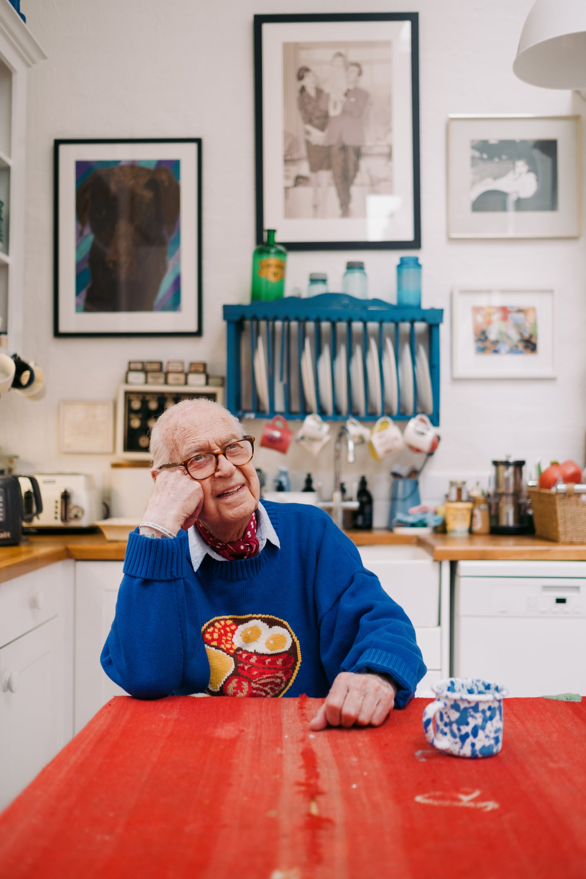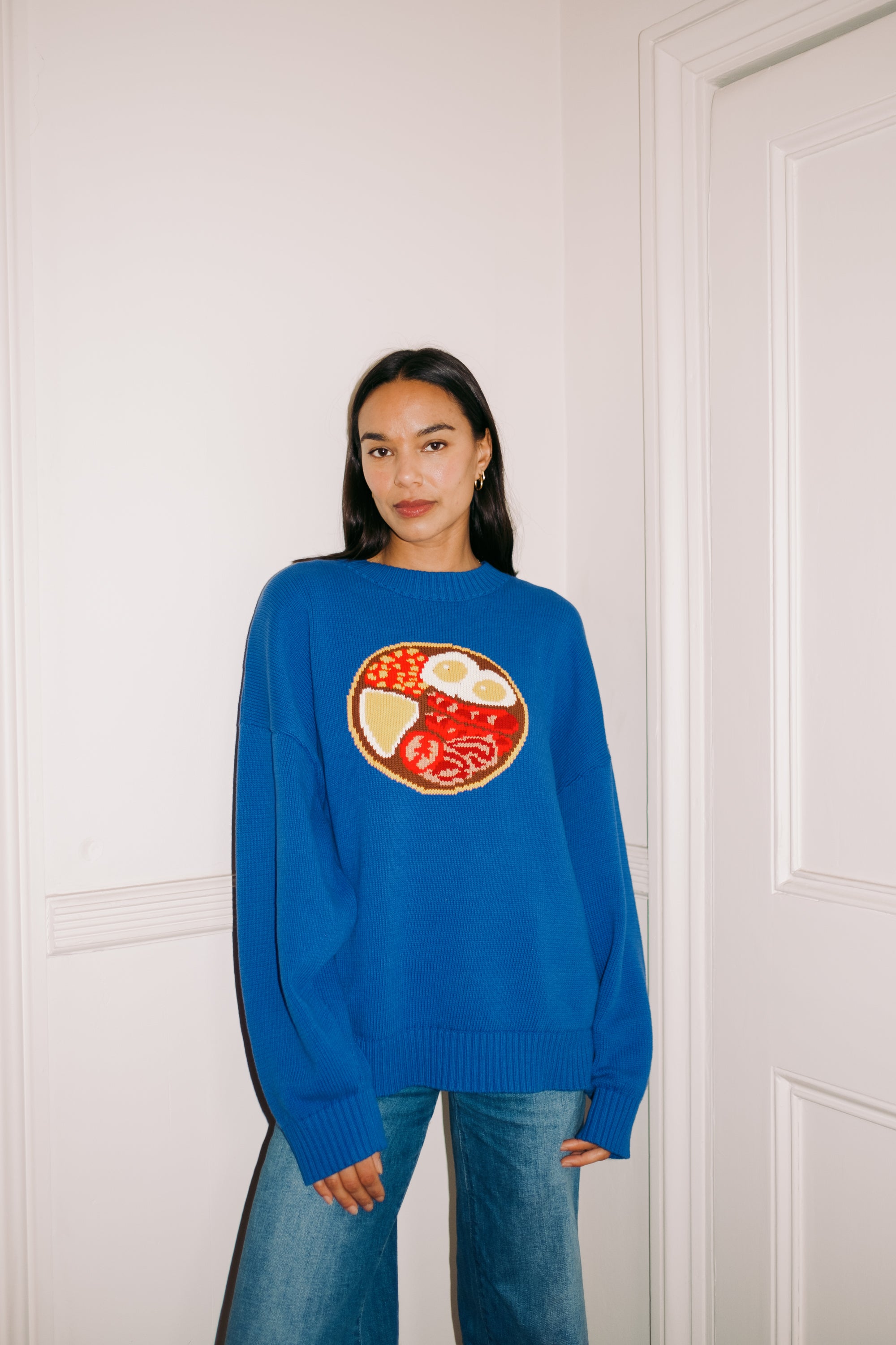 Amazing blue jumper with a full English breakfast plate. Designed to be worn by everyone....