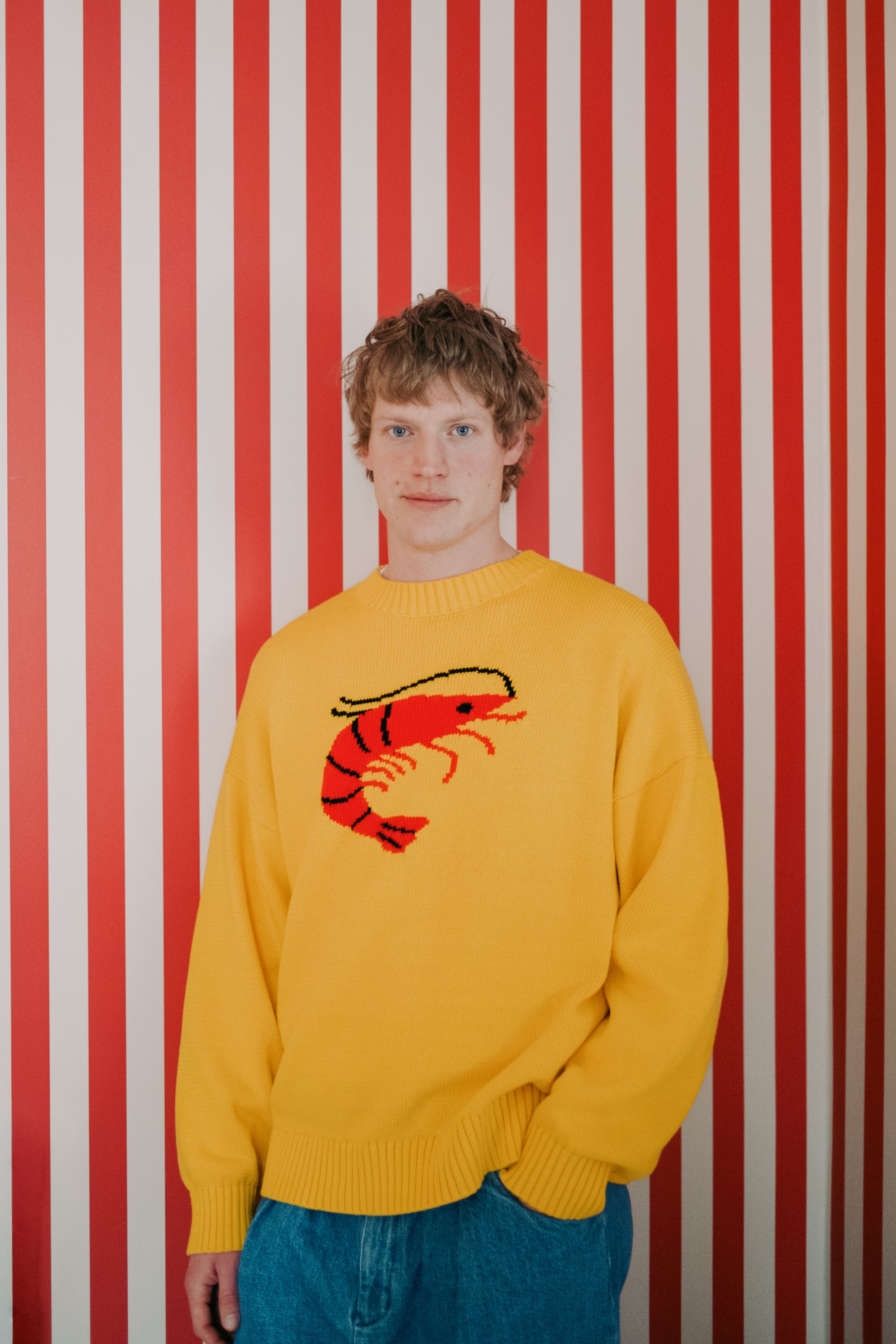 Wonderful and bold yellow jumper with a bright red shrimp! Designed to be worn by...