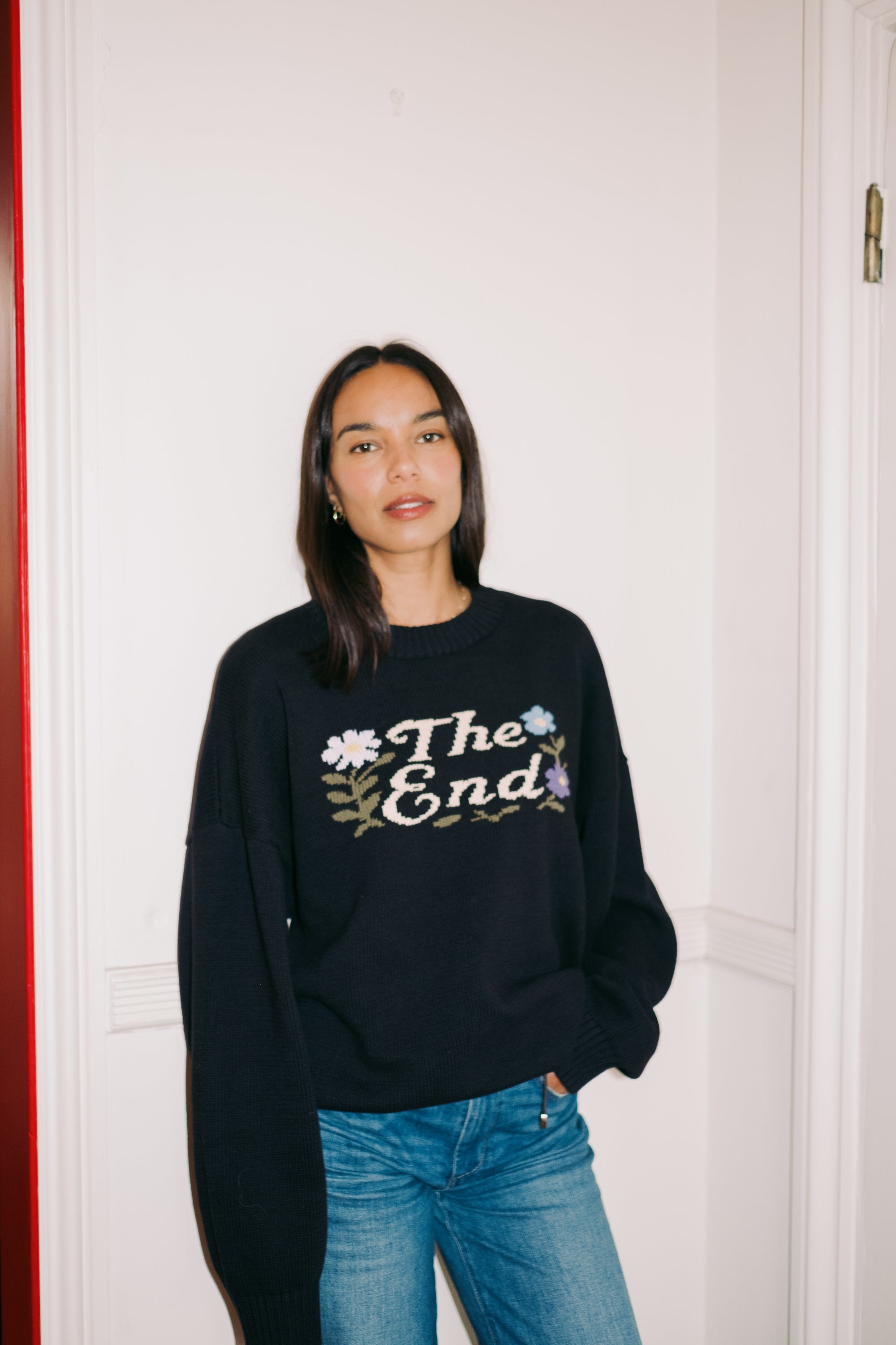 Black jumper in the unisex shape. Flowers surround 'The End' Designed to be worn by...