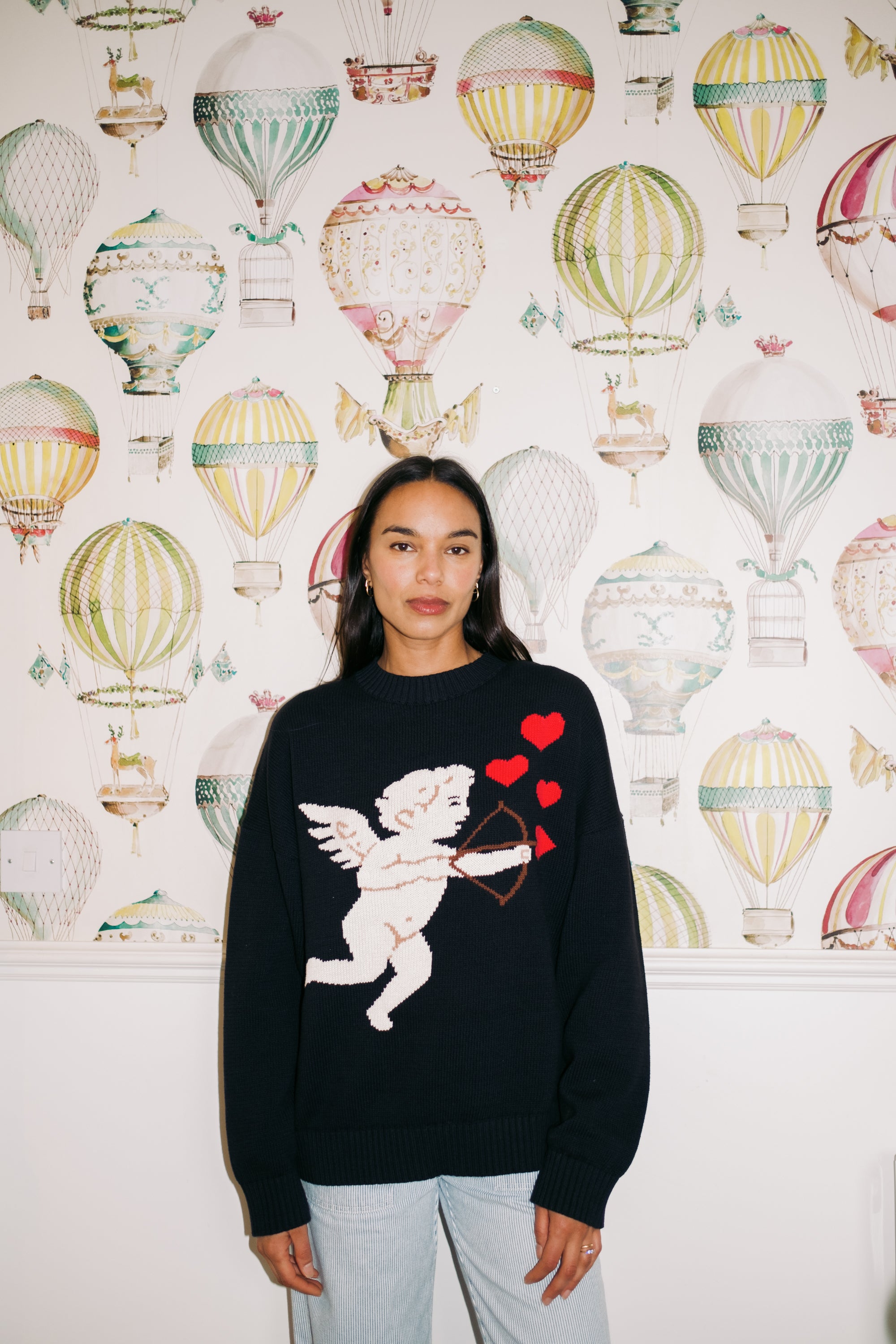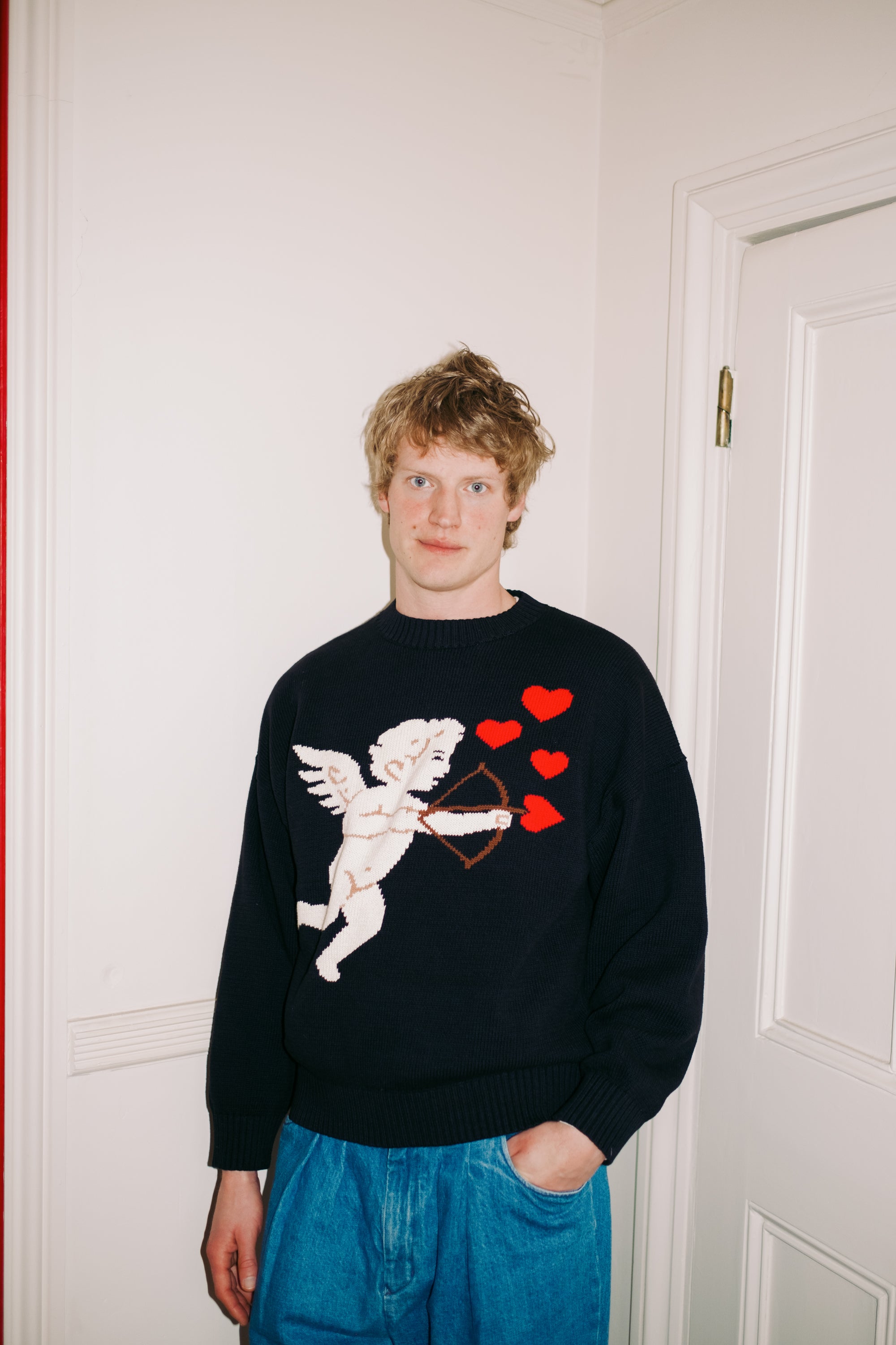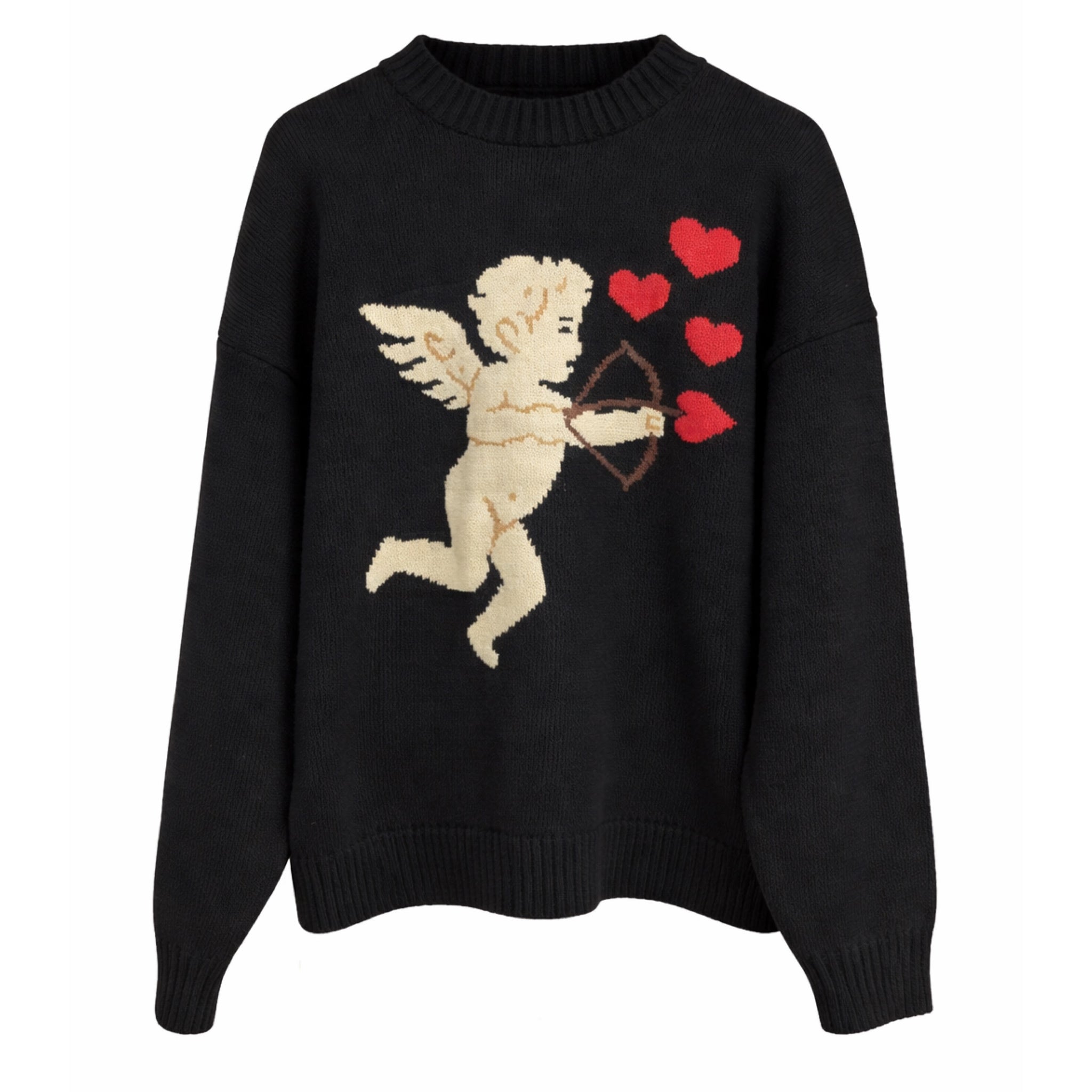 Heavenly black jumper with cupids bow and arrows of bright red hearts! Designed to be...